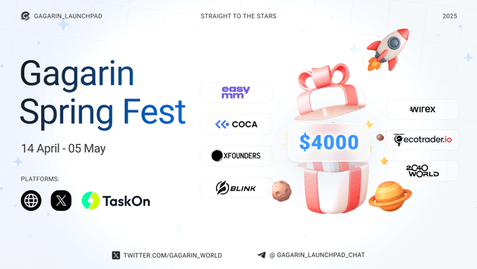 🌺 가가린 스프링 페스트에 오신 것을 환영합니다! 🌺 🗓 날짜: 4월 14일 - 5월 05일 📍 장소: 태스크온, 가가린 트위터 스페이스 & 가가린 텔레그램 🏆 상금: 4,000 테더 USDT(USDT) 가가린 스프링 페스트를 준비하세요! 연결하고. 배우고. 크게 승리하세요 — 웹3에서 빛나는 당신의 순간입니다. 🔽_____참여 방법