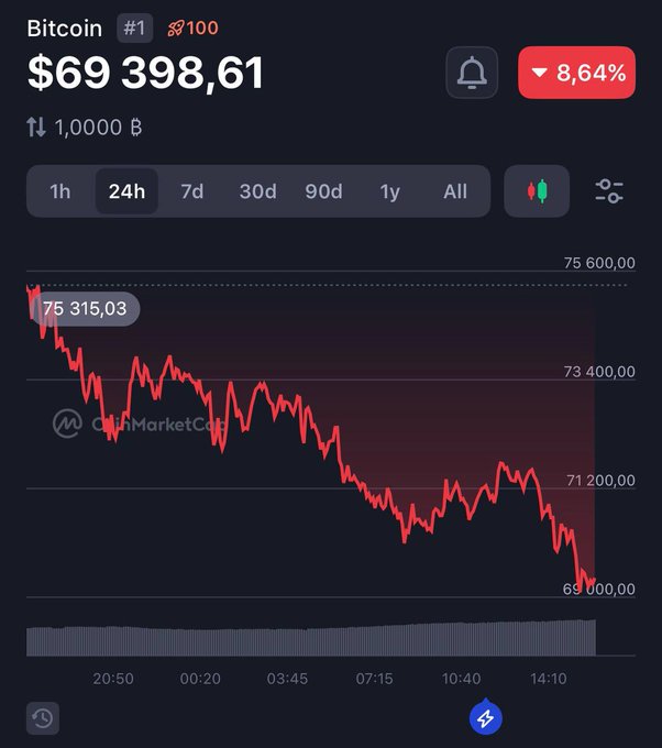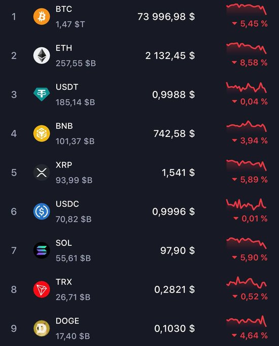 #비트코인이 74,000달러 아래로 급락했습니다. $ETH는 2,100달러까지 떨어졌습니다. 저점 돌파가 확인되었습니다 📉 2024년 11월 트럼프 당선 이후의 저점으로 되돌아갔습니다. 급격한 조정이 진행 중입니다. 항상 직접 조사하세요. → changenow.io/currencies/bitcoi...…