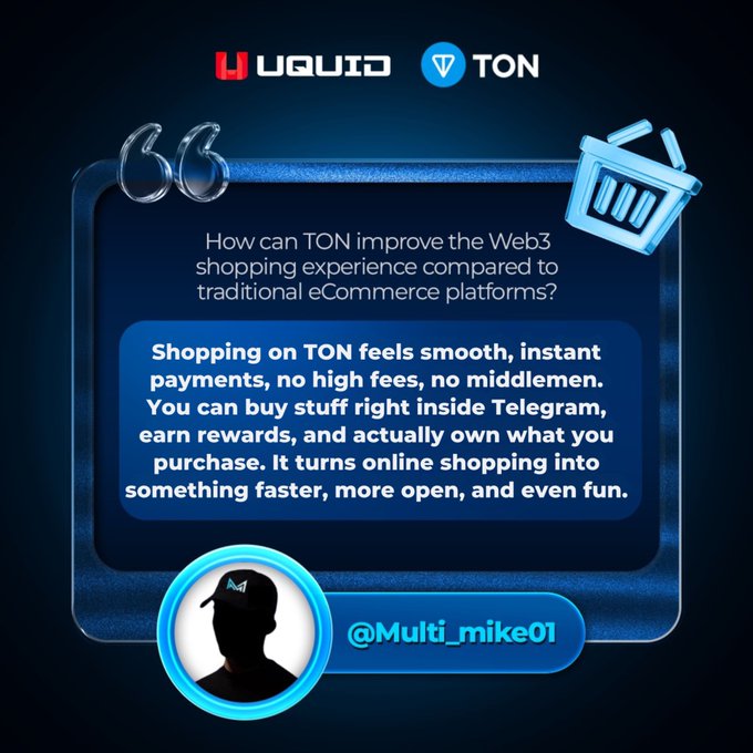 @Multi_mike01 님이 @ton_blockchain이 Web3 쇼핑의 판도를 어떻게 바꾸는지에 대해 정확하게 분석해 주셨습니다. "TON에서 쇼핑하면 부드럽고, 즉시 결제가 가능하며, 높은 수수료도 없고, 중간 유통업체도 없습니다. 텔레그램에서 바로 상품을 구매하고, 보상을 받고, 구매한 상품의 소유권을 실제로 갖게 됩니다. 온라인 쇼핑을 더 빠르고, 더 개방적이며, 심지어 더 재미있게 만들어 줍니다." 텔레그램에서 바로 수수료 없이 즉시 구매 + 진정한 소유권 + 보상 = 더 나은 쇼핑 경험 🔥 지금 바로 http:/shop.uquid.com, http:/uquid.com, http:/t.me/uquidbot, http:/t.me/uquidshopbot 에서 시작하세요.