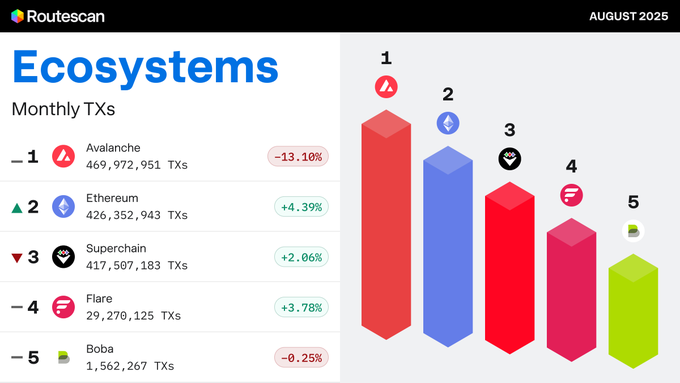 🚨월별 거래량 기준 상위 5개 생태계 – 월별 업데이트 🥇 눈사태 — 4억 6990만 TX(−13.1%) 🥈 이더리움 — 4억 2,630만 건의 거래(+4.4%) 🥉 슈퍼체인 — 4억 1,750만 건의 거래(+2.1%) 4️⃣ 플레어(Flare) — 29.3M TX (+3.8%) 5️⃣ Boba — 156만 TX(−0.3%) 아발란치는 7월에 비해 활동이 둔화되었지만 여전히 1위 자리를 지키고 있습니다. 이더리움은 계속해서 격차를 좁히고 있으며, 슈퍼체인은 꾸준한 성장세를 보이며 입지를 공고히 하고 있습니다. 출처: Routescan | 연구