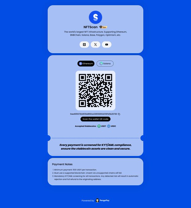 PengoPay를 사용하면 기업이나 개인 모두 30초 만에 스테이블코인 결제 사이트를 만들 수 있습니다. 저희 친구인 @nftscan_com은 이미 스테이블코인 결제 페이지를 만들었습니다. 다음 링크를 방문해 보세요: nftscan.pengopay.com 나만의 스테이블코인 결제 사이트를 만들고 싶으시다면, PengoPay에 오신 것을 환영합니다! 이메일로 등록하고 즉시 페이지를 만드세요! 고객 확인 절차(KYC)( 고객 신원 확인)가 필요 없으며, 자체 관리형 지갑을 사용하고 모든 결제는 KYT 및 AML(자금세탁방지) 검사를 거칩니다.