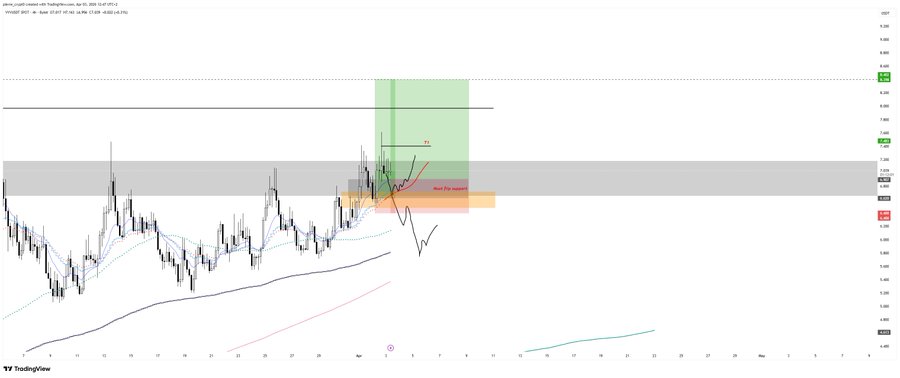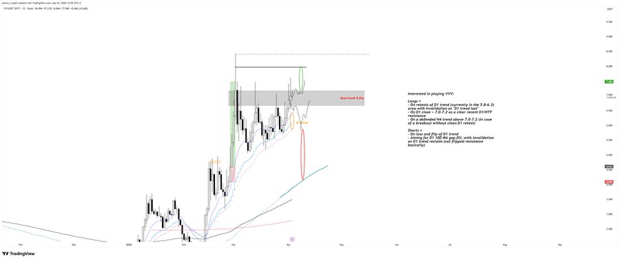 $VVV - H4/D1 어제 언급했던 6.9-7.2 D1 영역에서 저항이 있습니다. 제 생각에는 여기서부터: - 6.7-6.9에서 H4 추세를 방어하고 추가 상승 기회를 노릴 수 있습니다. - H4 추세를 방어하지 못하면, 제 생각에는 또 다른 돌파 시도 실패로 간주되어 다시 D1 추세 재테스트를 주로 모니터링해야 할 것입니다. twitter.com/pierre_crypt0/stat...