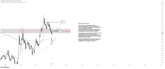 $HYPE - D1 확인된 하락, D1 트렌드와 35/37.5 주요 수평선 아래로 클로징. 어제 얘기한 플랜 그대로 갑니다: - D1 트렌드 x 35/37.5 영역 재돌파 확인 전까지 관망 - D1 200 EMA x D1 100 MA 하방(차트 블랙 서클 구역) 리테스트 대기 twitter.com/pierre_crypt0/stat...
