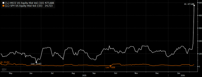$MSTZ (-2배 전략)의 10일 변동성이 완전히 폭발적으로 증가했습니다. 477%는 ETF 사상 최고 기록일 수 있습니다(비교를 위해 $SPY도 추가했습니다). 한때 433%까지 치솟았던 $QBTX보다도 높습니다. 극도로 높은 변동성은 마치 디젠(Degen) 미끼와 같아서, 지난주 이 ETF는 당연히 거래량 기록했습니다.