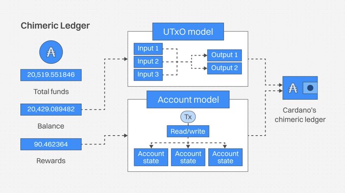 카르다노(Cardano) 하이브리드 또는 키메라 원장을 사용합니다. 두 가지 회계 모델이 함께 작동합니다. eUTxO 모델은 거래 수준에서 가치를 추적하는 반면, 계정 기반 모델은 스테이킹 및 보상을 관리합니다. 이러한 분리를 통해 정확한 회계 처리와 투명한 보상 계산이 가능해집니다.