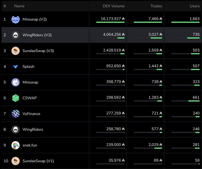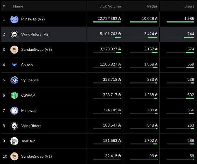 성능 스냅샷: 🥇 거래량/ Total Value Locked(TVL) ‣ 최고의 자본 효율성 🥈 카르다노(Cardano) 탈중앙화 거래소(DEX) 제공 ‣ 7 거래량 d ‣ 사용자 ‣ 거래 윙라이더스의 인기가 계속 상승하고 있습니다. 🫡 $WRT $ADA