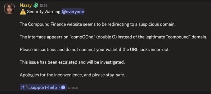 ⚠️@compoundfinance 사용자 여러분께 중요한 경고: Compound Finance 웹사이트가 의심스러운 도메인으로 리디렉션되는 것으로 보입니다. 특히, 앱 버튼을 클릭하면 URL에 "CompOOnd"가 포함된 피싱 도메인으로 이동합니다. Compound 팀에서 이 문제를 조사하고 해결하는 동안 DeFi Saver를 사용하여 Compound 포지션을 관리할 수 있습니다.