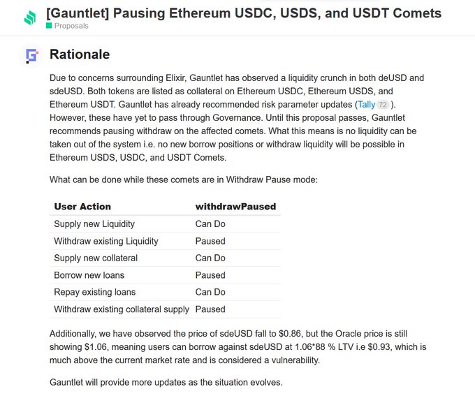 📢공지사항: 이더리움 메인넷의 @compoundfinance V3 시장 3개($USDC, $USDS 및 $ 테더 USDT(USDT) 가 일시 중단되었습니다. 시장을 일시 정지하면 유동성을 제거할 수 없으며, 시장에 유동성을 추가할 수만 있습니다. 이는 Compound 및 DFS 사용자에게 다음과 같이 해석됩니다. ❌인출 또는 대출