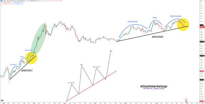 #알트코인 2020/2021년 vs #알트코인 2024/2025년 TOTAL2가 그때와 얼마나 비슷해 보이는지 놀랍지 않나요? 이런 현상은 2016/2017년에도 나타났습니다. 2026년 알트코인의 전망이 밝아 보이네요.