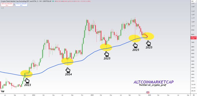 #알트코인 와, TOTAL3가 이제 주간 EMA100선에 진입했네요. 과거에는 이 선에서 매번 강한 반등이 나타나는 것을 목격했습니다. 참고: (W) EMA100은 알트코인의 불 을 결정합니다.