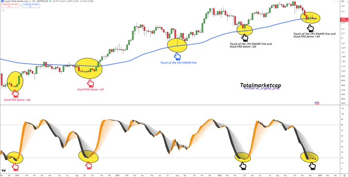 #알트코인 $BTC 잊지 마세요: Totalmarketcap이 (W) EMA90에 닿으면 과거에 종종 추세 반전으로 이어졌습니다. (W) EMA90에 닿고 StockTKD가 20 아래로 떨어지면 더욱 좋습니다. 이러한 조합은 매우 드물며 일반적으로 암호화폐 시장의 바닥을 나타냅니다.👀🔥