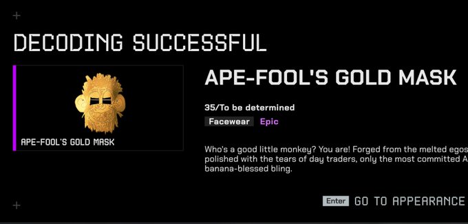 내 OTG "골든 에이프(Ape)-푸울스" 마스크를 받았어요! 민트(Mint) #35 (현재 게임에서 가장 희귀한 아이템) 누가 원하나요?