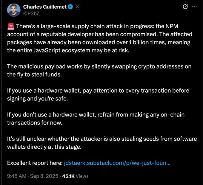 🚨속보: Ledger CTO Charles Guillemet는 NPM 계정이 유출된 후 JavaScript 생태계에서 공급망 공격이 발생할 수 있다고 경고했습니다. 그는 사용자들에게 하드웨어 지갑을 사용하는 경우 모든 거래를 신중하게 확인하고, 그렇지 않은 경우 온체인 거래를 완전히 피하도록 권고합니다. 안전하게 지내세요.