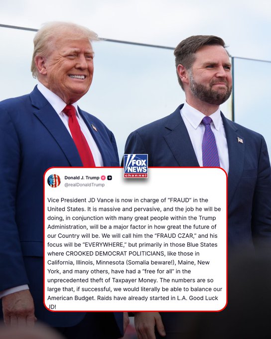 새 소식: 트럼프 대통령이 납세자 사기 조사를 위해 JD 밴스 부통령을 "사기 전담 책임자"로 임명했습니다. 트럼프 대통령은 "밴스 부통령의 조사 대상은 '모든 곳'이겠지만, 특히 캘리포니아, 일리노이, 미네소타, 메인, 뉴욕과 같은 민주당 강세 지역에 집중될 것"이라고 밝혔습니다.