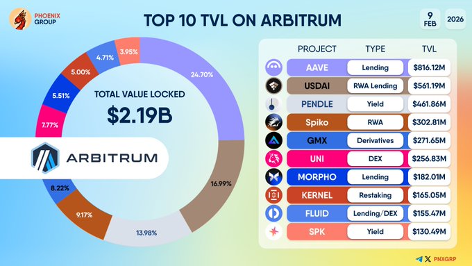 @ARBITRUM의 상위 10개 #TVL $AAVE $USDAI $PENDLE #스피코 $GMX $UNI $MORPHO $KERNEL $FLUID $SPK