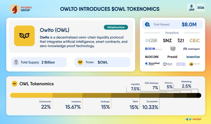 🔥 @Owlto_Finance가 토큰 경제학을 소개합니다 $OWL #Owlto는 크로스체인 브리지 프로토콜을 위한 유틸리티 및 거버넌스 토큰인 $OWL에 대한 토큰 경제학을 도입했습니다. 배당: 22.0% - 커뮤니티 15.67% - 투자자 15.0% - 에어드롭 15.0% - 팀 10.33% - 생태계 7.5% - 유동성 7.0% - 중앙화 거래소(CEX) 에어드롭 5.0% - 자문 2.5% - 마케팅 Owlto는 인공지능, 스마트 계약 및 영지식 증명 기술을 통합한 탈중앙화 옴니체인 유동성 프로토콜입니다. 👉 http:/x.com/Owlto_Finance/stat...…