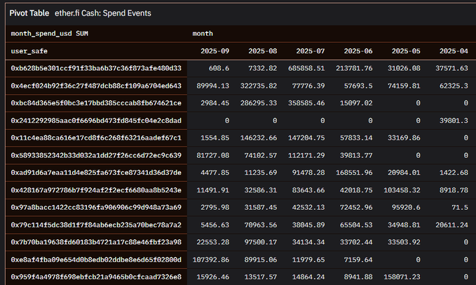 방금 이더파이 카드 듄 대시보드를 만들었습니다. 가장 많이 지출하는 사람과 매달 얼마를 지출하는지 확인할 수 있고, 그들이 누구인지도 파악할 수 있습니다 (이 부분은 독자 여러분의 연습으로 남겨두겠습니다). dune.com/bayes6/etherfi-card-u...… twitter.com/tzedonn/status/196...
