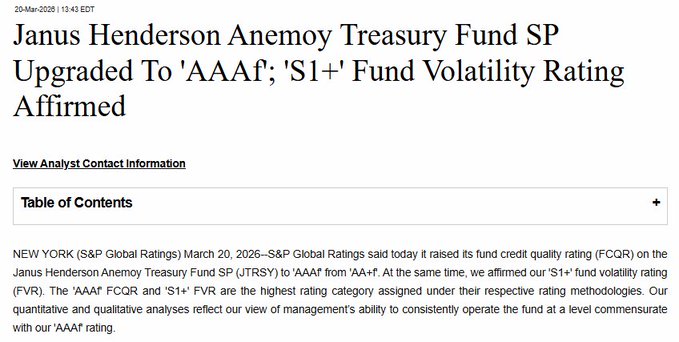 JTRSY가 @SPGlobalRatings로부터 'AAAf' 등급으로 상향 조정되었습니다. @anemoycapital과 @JHIAdvisors가 운용하는 센트리퓨즈(Centrifuge) 기반의 토큰화된 트레져리 펀드가 현재 최고 등급의 펀드 신용 등급을 획득했습니다. 최고 등급인 'S1+' 펀드 변동성 등급도 재확인되었습니다. twitter.com/centrifuge/status/...