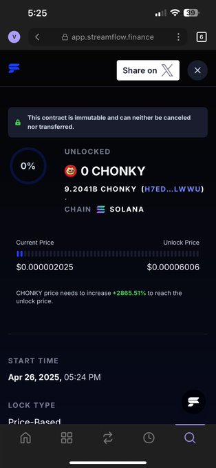 약속대로 $CHONKY 공급량의 1.85%가 시가총액 3천만 달러에 도달할 때까지 잠겼습니다. 모두 @streamflow_fi를 통해 완료되었습니다. solscan.io/account/CmKrhs7KCoz...… 추신: 이 거래가 풀리기 전까지는 아내에게 말하지 마세요 🤣
