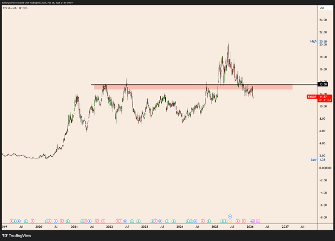 $BYD #1211 BYD는 판매량에서는 테슬라를 앞서고 있지만, 차량당 이익은 매우 적습니다. 이 수준에서 저항선이 형성되는 것은 좋지 않아 보입니다. 3월에 있을 다음 실적 발표에서 실수를 하지 않기를 바랍니다. twitter.com/LSDinmycoffee/stat...