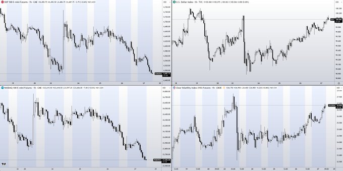 매크로 스냅샷 이후 업데이트 선물 지수는 주 초반 반등분을 되돌렸습니다. DXY 가격이 다시 100달러 근처로 돌아왔습니다. VIX 선물 거래량 상승 DXY 지수 상승과 변동성 상승은 본질적으로 위험 회피 및 보호 수단 구매를 의미합니다. twitter.com/52kskew/status/203...