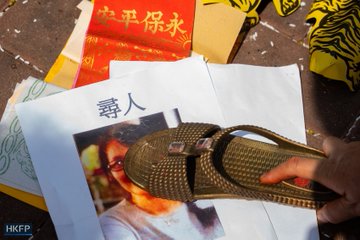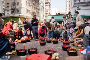 목요일, 신도들이 홍함의 복탁사(福洪寺)에 모여 음력 설날 후 몇 주 뒤에 열리는 '곤충의 각성' 축제인 징저(靈未)를 기념했습니다. 징저는 광둥어로 '다시우옌(大良宗)'이라고 하는 '악마 퇴치'로 유명한데, 이는 종이 인형과 향을 이용해 적을 저주하는 전통 풍습입니다. 사진: 카일 람/HKFP.