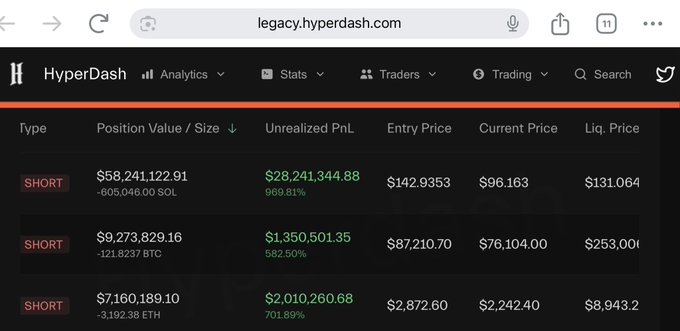 17시간 전에 이 트레이더는 $BTC 및 $ETH 종목에 대해 각각 $75,500 및 $2,230의 가격으로 DCA(분산 매입법)를 사용하여 숏 포지션을 청산했습니다. 현재 그의 모든 숏 포지션에서 발생한 미실현 이익은 약 3,150만 달러입니다. 주소: legacy.hyperdash.com/trader/0x...…