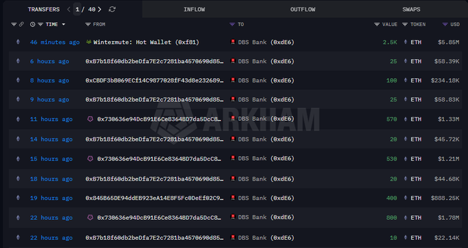 1시간 전, #DBS_Bank는 윈터뮤트(Wintermute) 로부터 2,500달러(약 585만 달러) 상당의 자금을 추가로 받았습니다. 그는 일주일 만에 평균 진입 금액 약 2,463달러로 총 24,898 $ETH (약 6,134만 달러)를 모았습니다. 주소: intel.arkm.com/explorer/entity...…