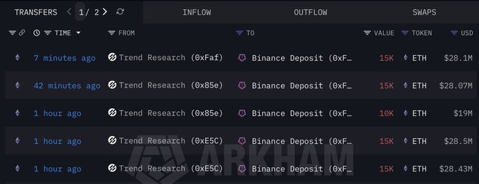 지난 24시간 동안 #TrendResearch가 #Binance에 127,000달러(약 2억 3,800만 달러)를 입금했습니다. 패닉 셀인가요? 주소: intel.arkm.com/explorer/entity...…