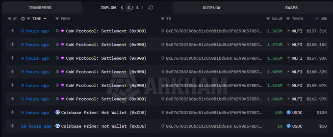 9시간 전, 새로운 지갑에서 #Coinbase에서 10M $USDC를 인출하여 $WLFI를 모았습니다. 방금 그는 74.5M $WLFI(약 $845만)를 매수했습니다. 주소: intel.arkm.com/explorer/addres...…