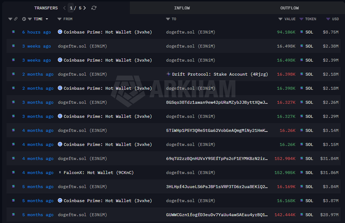 6시간 전, 고래 투자자 #dogeftw_sol이 #Coinbase에서 94.1k $SOL (약 875만 달러)를 인출했습니다. 보통 그는 그 모든 자금을 #Drift_Protocol에 예치(stake) 할 것입니다. 지난 5개월 동안 그는 총 360,500달러(약 7,224만 달러)를 투자했습니다. 주소: intel.arkm.com/explorer/addres...…