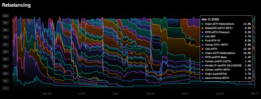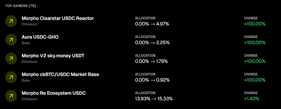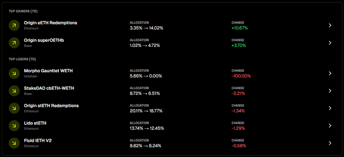 지난 7일 동안 yoVaults는 어떻게 최적화된 상태를 유지했나요? yoETH는 LST 할인 전략에 더욱 집중했습니다: → @OriginProtocol eETH 차익거래가 지속됨에 따라 eETH 상환 규모가 확대되었고, 유휴 유동성 확보를 위해 Base에 superOETHb가 추가되었습니다. → Unichain의 Morpho Gauntlet WETH가 매도되었습니다.