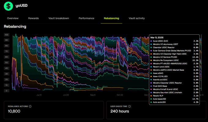 새로운 달, 새로운 리밸런싱 데이터가 나왔습니다. ⚖️ 2월에는 yoUSD의 위험 노출을 줄이고 담보와 차입 수요가 가장 강한 곳으로 자본 이동시키는 데 집중했습니다. → @Morpho Re Eco USDC (+15%) & @SentoraHQ PYUSD (+16%) → @ClearstarLabs 고수익 USDC yoUSD의 Total Value Locked(TVL) 현재 약 3,800만 달러에 달하는 큰 이유 중 하나입니다. 💪