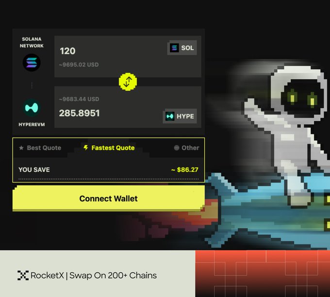 저 번개 보이세요? RocketX가 스왑 거래에 대한 가장 빠른 견적을 확정하는 모습입니다! 200개 이상의 체인에서 초고속 체결을 경험하세요. 10개 이상의 DEX/CEX에서 일일이 환율을 비교하는 번거로움은 이제 잊으세요. 클릭 한 번으로 최고의 속도와 간편함을 누리세요. 시간과 비용을 모두 절약할 수 있습니다. 지금 바로 사용해 보세요: app.rocketx.exchange