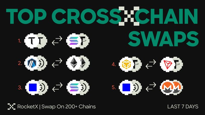지난주 RocketX에서 가장 많이 크로스체인 스왑된 토큰은 다음과 같습니다. 🔄