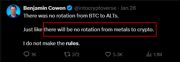 👊거인들의 충돌👊 @intocryptoverse vs @CryptoMichNL 벤 코헨: "금속에서 암호화폐로의 자금 이동은 없을 것입니다." 마이클 반 데 포페: "자본 비트코인 및 암호화폐와 같은 다른 자산으로 이동할 것입니다." 의견을 댓글로 남겨주세요👇