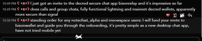 @utxostudios 님, bisonrelay 초대해 주셔서 감사합니다! notsofast_alpha meowspace에서 저와 맞팔하시는 분들은 연락 주세요. 초대 키를 생성하고 자금을 지원해 드리겠습니다.