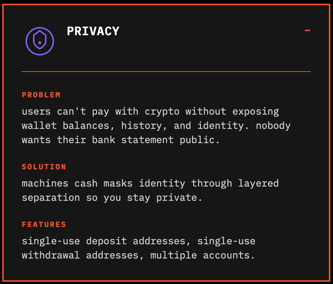 개인정보 보호는 상품이나 설정이 아닙니다. 기계에게 개인정보 보호는 기본 설정이며, 내부적으로 작동합니다. 사용자는 일회용 주소로 입금하고, 이 주소는 지출 계좌로 자금을 이체합니다. 또한 사용자는 일회용 출금 주소로 출금하고, 이 주소는 사용자의 지갑으로 자금을 이체합니다.