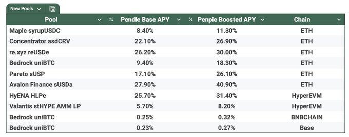 더 많은 풀, 더 높은 수익률을 @Penpiexyz_io에서 누리세요.📈 Penpie @pendle_fi에서 새롭게 출시된 10개의 풀을 통합하여 최대 40%의 연이율 (연간 수익률) 을 제공하는 새로운 투자 기회를 열었습니다. $PENDLE⚡️ 새로운 풀을 확인하고 서둘러 포지션을 잡으세요👇