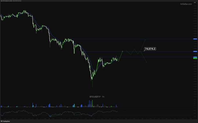 비트코인 1H #V 대빵(V형) 반등 진행 중, 1차 목표 74K 구간, 최고 78.9K까지 뚫을 수도 있음 롱 물리신 분들 계속 홀딩 가능 숏은 반등 후 주요 저항 구간에서 꺾이는 시그널 기다리셈 --- Discord 합류 👉 http:/0xTaiBai.com