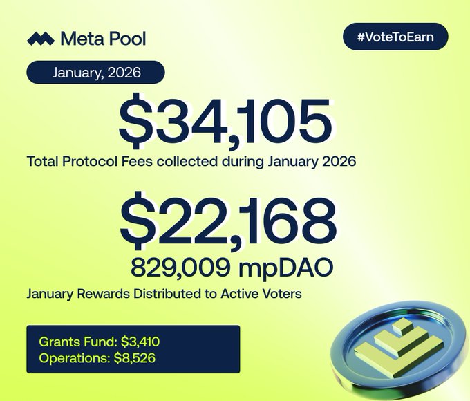 🗳️ 메타 풀 분산형 자율 조직(DAO) 보상 지급 — 2월 3일. 1월 한 달 동안 징수된 총 프로토콜 수수료: 34,105달러 활동적인 유권자에게 배정된 금액은 22,168달러입니다. 🔹829,009mpDAO 🧵👇