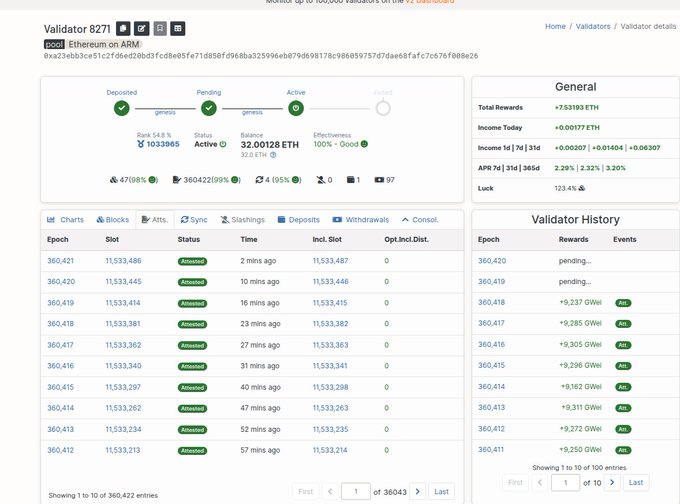 Contributing to the decentralization of the #Ethereum network by providing ARM images. Staking on a $189 ARM board using ~10w of power. http://discord.gg/jU9cP64mPe
