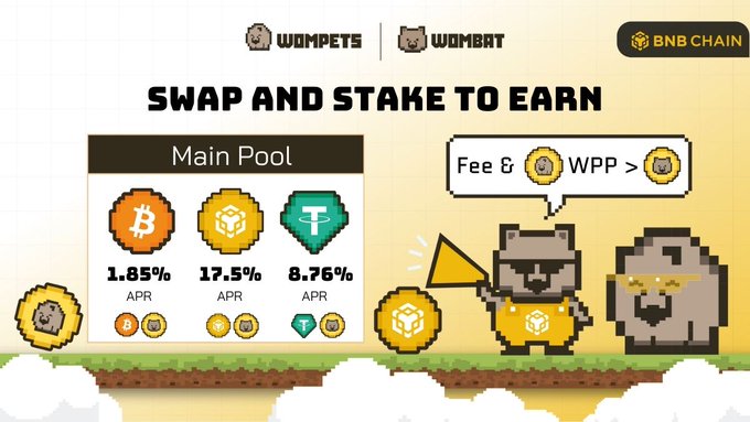 @BNBCHAIN의 Wombat Main Pool은 여전히 아침 팬케이크보다 더 맛있어 보입니다 💸 즐길 수 있는 예치(stake) : ✨ $BTCB에 1.85% APR ✨ $BNB 연이율 17.5% ✨ $USDT에 8.76% APR 모든 실질 수익(수수료 공유, 배출 없음). WPP를 모아 Wompets 미니 게임을 플레이하고 $WOM 보상을 받으세요. $WOM DeFi 카지노에서 더 많은 당첨 기회를 잡으세요. 🐻 바이낸스 코인(BNB) 체인에서 게임화된 DeFi가 더욱 재미있어집니다! 🎲