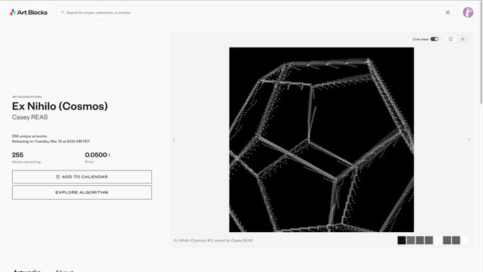 Ex Nihilo (코스모스(Cosmos))가 3월 10일 오전 9시(태평양 표준시)에 Art Blocks에서 출시됩니다. Art Blocks에서 출시하는 제 여덟 번째 작품이자 2024년 이후 첫 작품입니다.