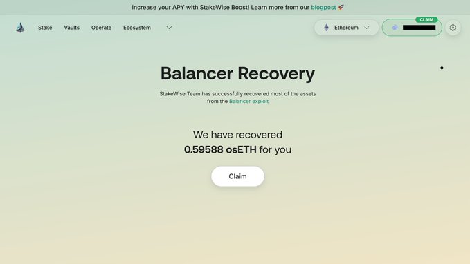 Balancer 해킹으로 피해를 입은 LP 여러분께 알립니다 🚨 이제 StakeWise UI를 통해 해커로부터 되찾은 osETH 및 osGNO를 청구할 수 있습니다. 답글에 링크(Chainlink) (X 알고랜드(ALGO) 만족시키기 위해 🥲)