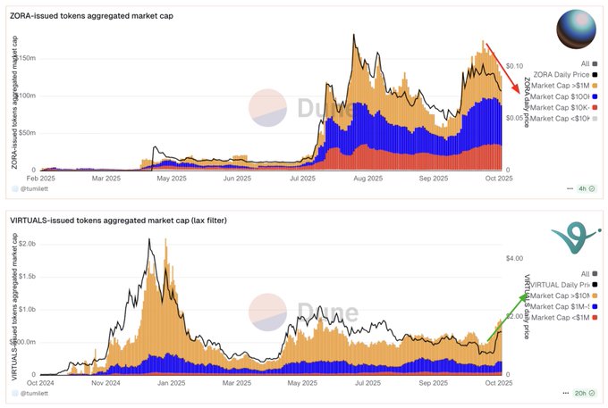 트레이딩 아이디어: $VIRTUAL 매수, $ZORA 숏 . Base의 투기적 활동으로 이득을 보는 "런치패드"는 단 하나뿐이며, x402, 로보틱스 및 예측 시장 에이전트와 함께 VIRTUALS를 활용하고 ZORA에 매달 투자자가 투자금을 확보할 수 있다고 생각합니다(제 말이 틀렸다면 인용하지 마세요). 초액체