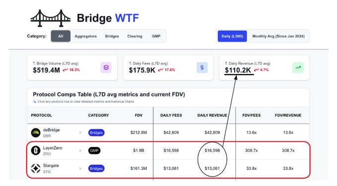 LayerZero의 $STG 인수가 마무리됨에 따라, LayerZero의 일일 수익은 $16.6k에서 $29k로 상승할 것으로 예상되며, 이는 전체 Interop 시장의 26%에 해당합니다. $DBR과 경쟁할 X-체인 스왑 상품이 출시될 예정이라는 소식이 들려왔습니다(일일 수익이 $40k 추가될 수 있다는 의미). http:/bridgewtf.com 관련 데이터