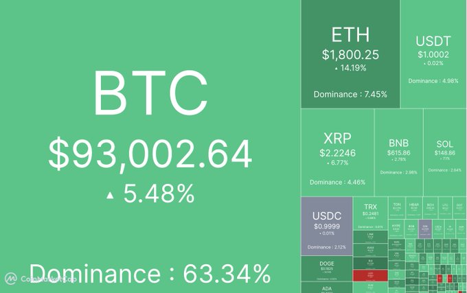 오늘 시장이 신선하고 맛있어 보입니다 🟩 비트코인(BTC)이 93,000달러에서 순항 중 (+5.48%), 이더리움(ETH) 불이 붙음 (+14.19%), 리플(XRP) +6.77%, 그리고 솔라나(SOL) +7.1%. 오늘 암호화폐에 녹색이 잘 어울립니다 😎 #RoseonX에서 지금 거래하세요 👉 dex.roseon.world/#/trade