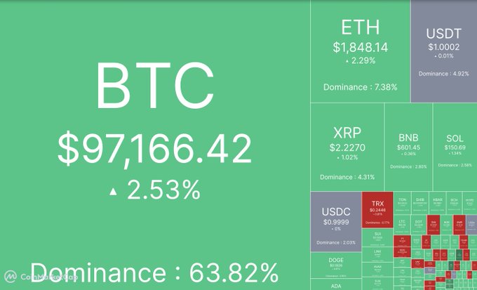 비트코인(BTC)이 마침내 10만 달러를 돌파할 수 있을까요? 🤔비트코인(BTC)이 9만 7천 달러에 도달하고 알트코인들도 상승 중: 이더리움(ETH), 바이낸스 코인(BNB), 리플(XRP), 솔라나(SOL)도 녹색 🟩 시장이 달아오르고 있습니다 - 지켜보고 계신가요 아니면 참여하고 계신가요? 🔥 <#RoseonX>에서 지금 거래하세요 👉 dex.roseon.world/#/trade