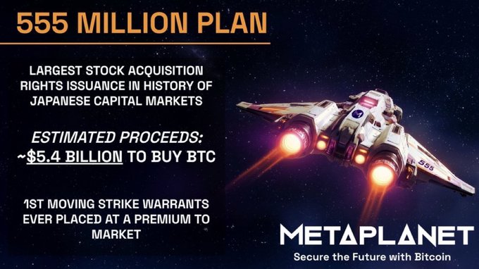 새로운 소식: 메타플래닛은 5억 5500만 비트코인(BTC) 계획(555 Million Plan)에 따라 2026년 말까지 10만 비트코인을 확보할 계획입니다. 이 목표를 달성하려면 현재 도쿄에 본사를 둔 메타플래닛이 보유하고 있는 40,177 비트코인(BTC) 코인을 두 배 이상 늘려야 합니다.